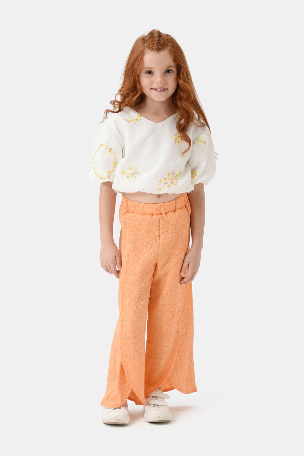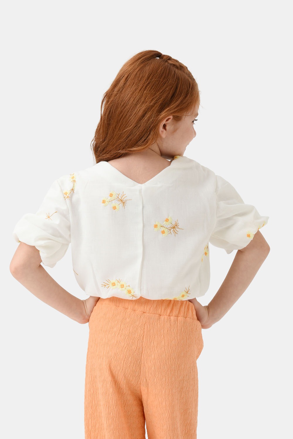 توب بناتي ابيض بنمط برتقالي بقصة عادية